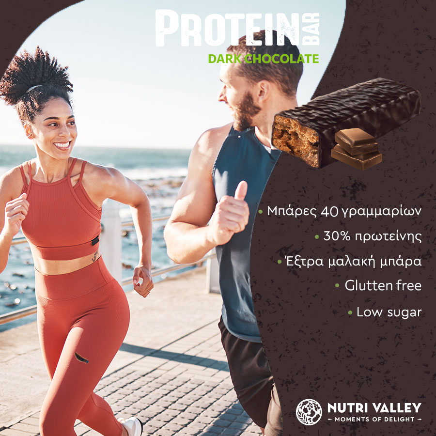 Μπάρα πρωτεΐνης με γεύση σοκολάτας. Με σάκχαρα και γλυκαντικά. Συστατικά: Μείγμα πρωτεϊνών 28,2% (απομονωμένη πρωτεΐνη σόγιας, πρωτεΐνη ορού γάλακτος), απομίμηση σοκολάτας υγείας με γλυκαντικά 24,8% (γλυκαντικά: μαλτιτόλη και γλυκοζίτες στεβιόλης, φυτικά λίπη πλήρως υδρογονωμένα (φοινικοπυρηνέλαιο), σκόνη κακάο μειωμένων λιπαρών 15%, γαλακτωματοποιητής: λεκιθίνη σόγιας, αρωματική ύλη βανιλλίνη) σιρόπι από ολιγοσακχαρίτες φρουκτόζης (FOS), γλυκαντικά 15,7% (σιρόπι μαλτιτόλης, σιρόπι σορβιτόλης), κρέμα φουντουκιού με κακάο και γλυκαντικά 3,9% {γλυκαντικά (μαλτιτόλη και γλυκοζίτες στεβιόλης), φυτικά έλαια (ηλιέλαιο και βαμβακέλαιο σε μεταβαλλόμενες αναλογίες), φουντουκόπαστα 13%, σκόνη κακάο μειωμένων λιπαρών 10%, ορός γάλακτος σε σκόνη, πλήρες γάλα σε σκόνη, άπαχο γάλα σε σκόνη, βούτυρο κακάο, γαλακτωματοποιητής: λεκιθίνη σόγιας, αρωματικές ύλες}, φοινικέλαιο, σκόνη κακάο, καρύκευμα (δεξτρόζη, φρουκτόζη, φυσική αρωματική ύλη, λακτόζη, σκόνη κακάο, αντισυσσωματωτικό: διοξείδιο του πυριτίου), τραγανοί κόκκοι σόγιας με κακάο (πρωτεΐνη σόγιας, σιμιγδάλι ρυζιού, ζάχαρη, σκόνη κακάο μειωμένων λιπαρών, αλεύρι σόγιας, αλάτι, αρωματική ύλη), ζελατίνη φυσική, βούτυρο κακάο, αρωματική ύλη, γαλακτωματοποιητής: λεκιθίνη σόγιας, αντιοξειδωτικό: εκχύλισμα τοκοφερολών. Η υπερβολική κατανάλωση μπορεί να έχει υπακτική δράση.